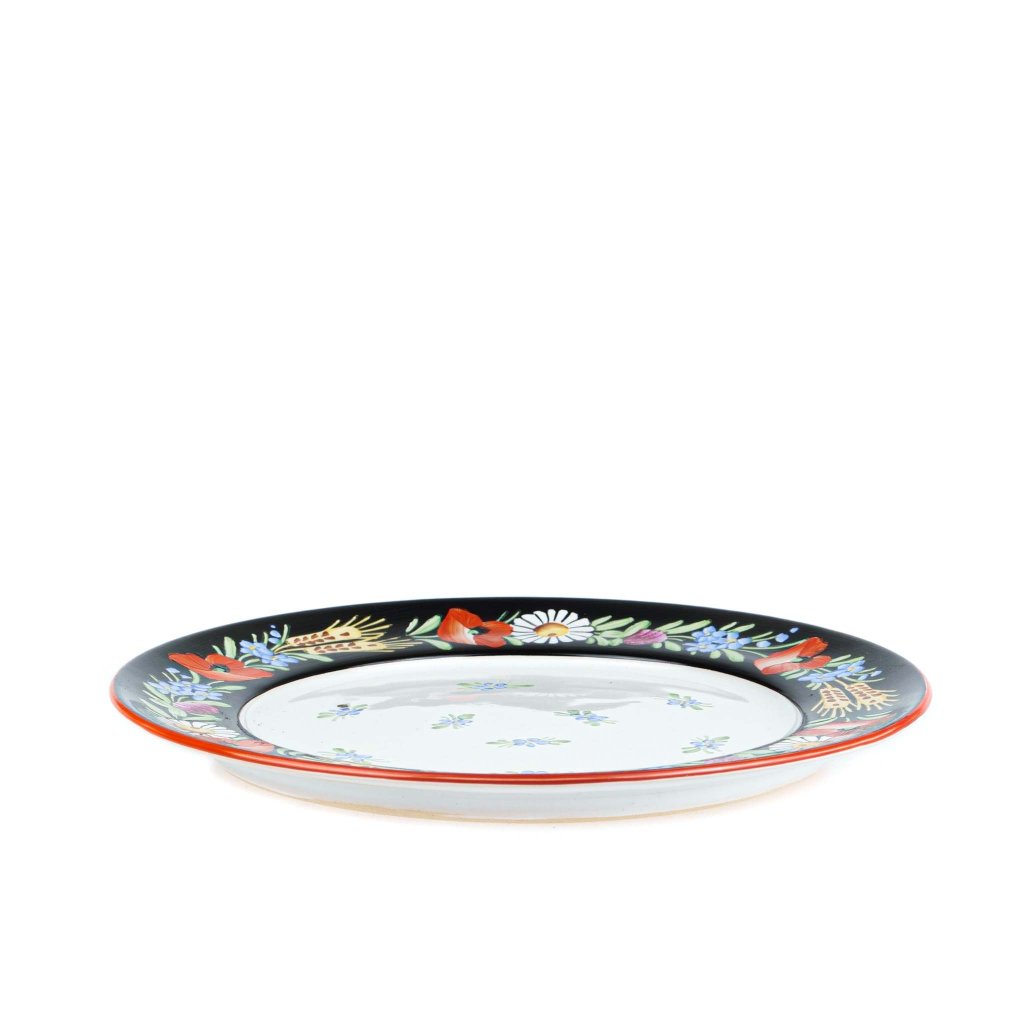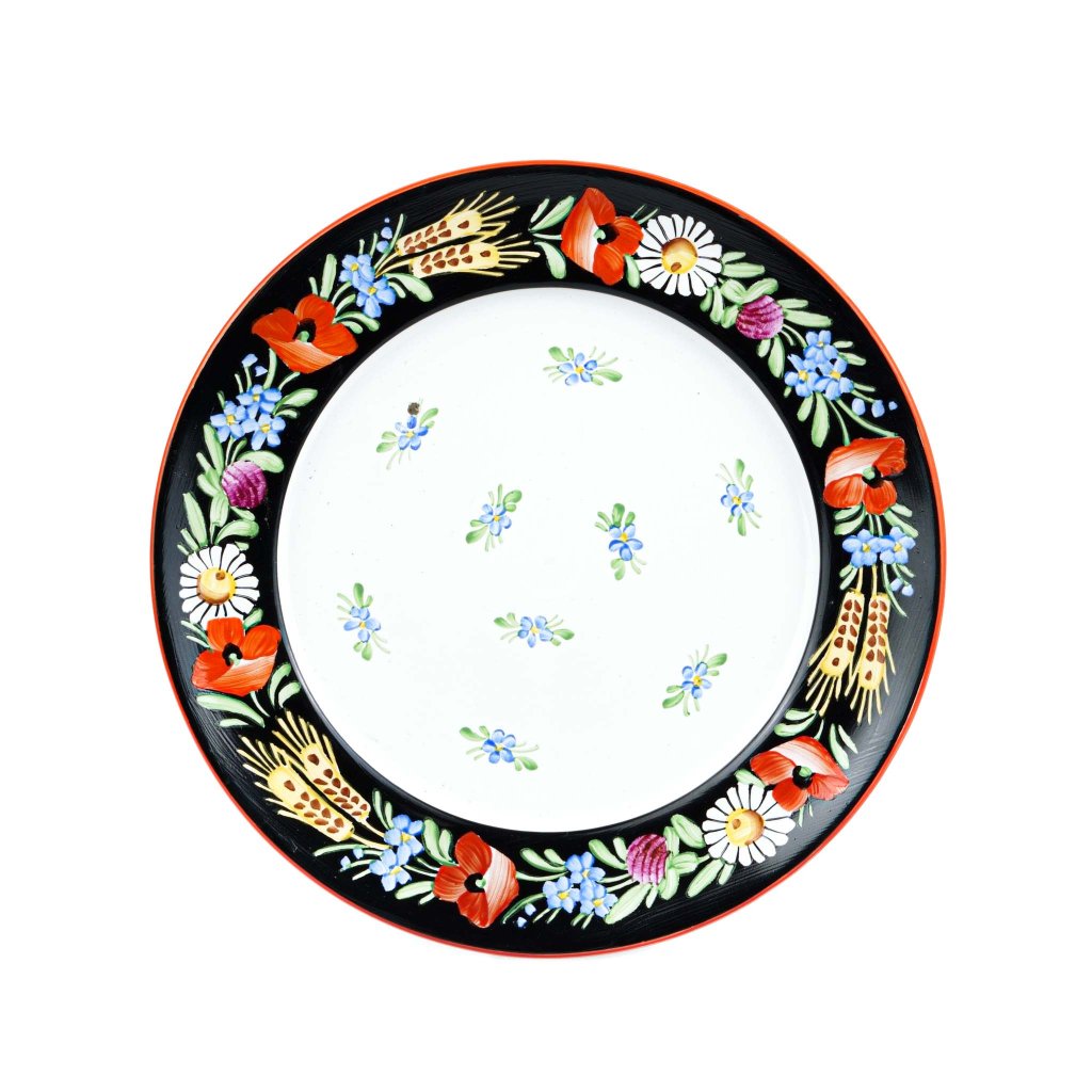 Dezertní talíř z chodské keramiky. Vnitřní plocha s jemnějším vzorováním odlišuje právě tuto jídelní edici talířů od klasických ozdobných. Talíř je pevný a vyroben právě pro každodenní potřeby stolování.